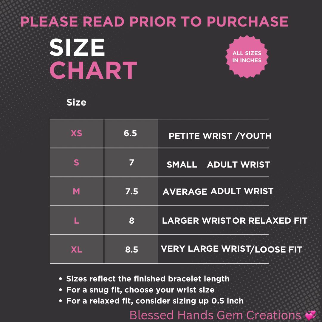 PLEASE READ: Please make sure to measure your wrist before purchasing. Bracelet sizes are measured by inner circumference and not by bracelet length. This is because the fit will be very different depending on the size of the beads. For a snug fit use your exact wrist size. If you prefer a more comfortable or loose fit add 1/4 or 1/2 Inch.