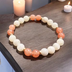 This beautiful Peach Moonstone & Carnelian beaded bracelet contains high grade 8mm Natural Peach Moonstone beads & Carnelian. Each bead in this bracelet are hand picked and strung on high quality elastic stretch cord to ensure the best quality.