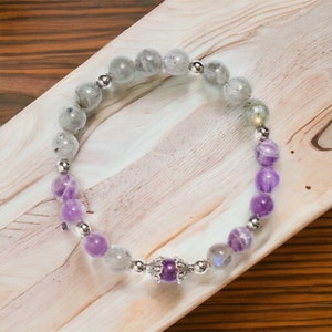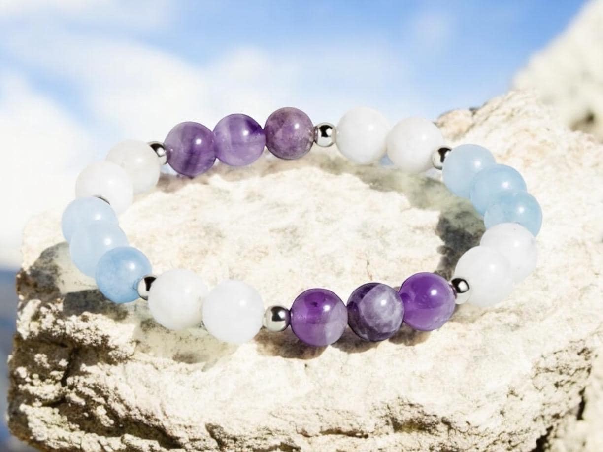 Description: 8mm Amethyst, Aquamarine & Moonstone Embellished with silver space beads