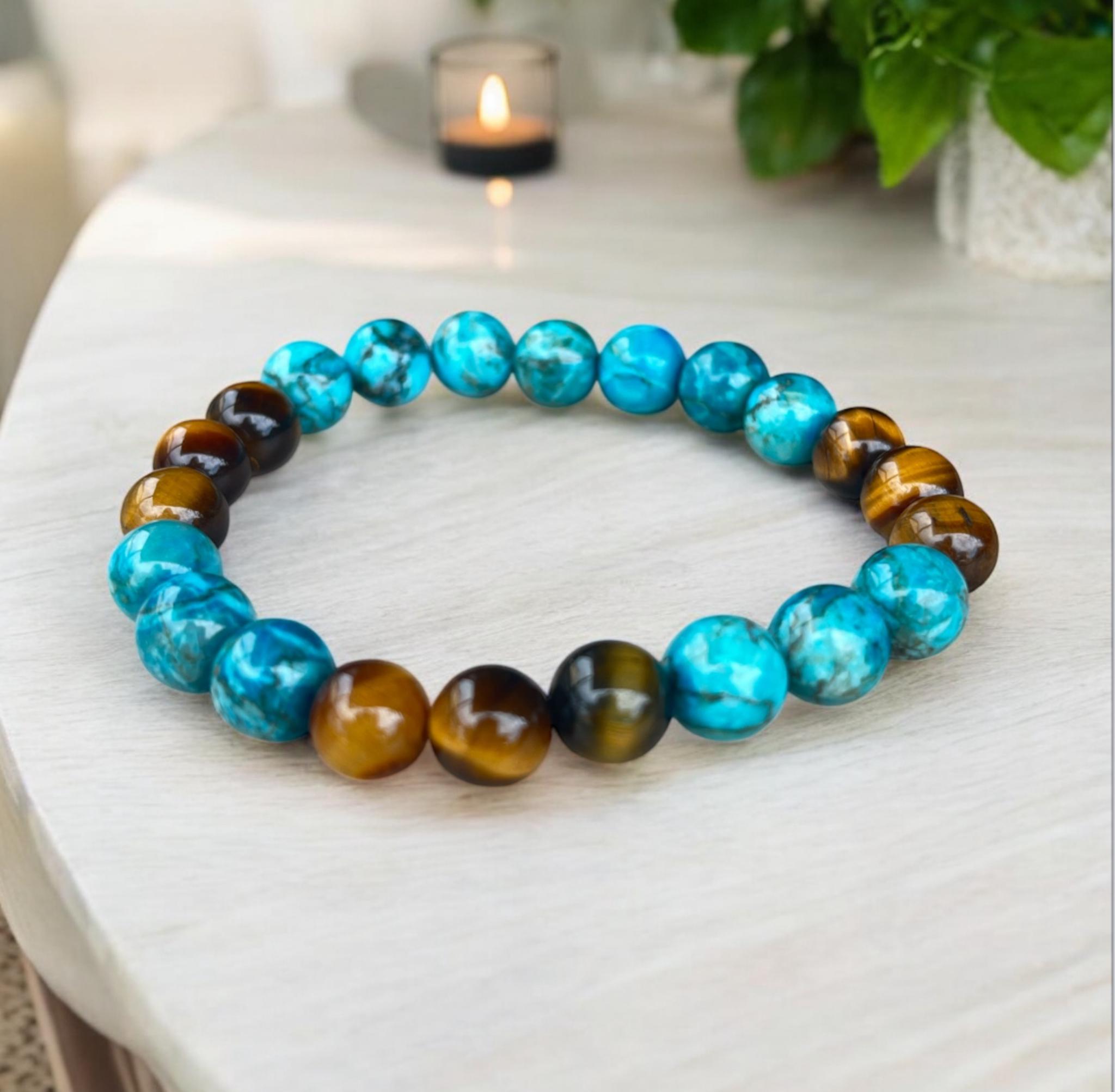 Handcrafted on a durable stretch cord with Turquoise and Tiger's Eye gemstones.