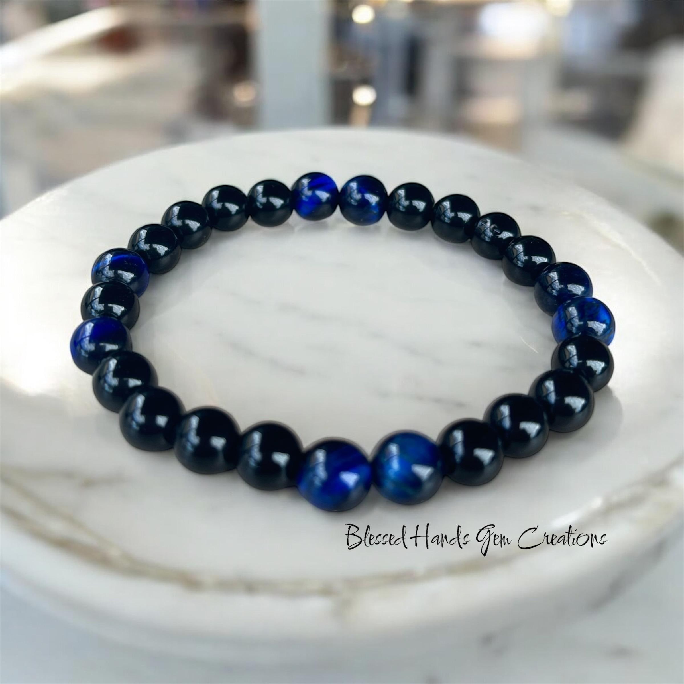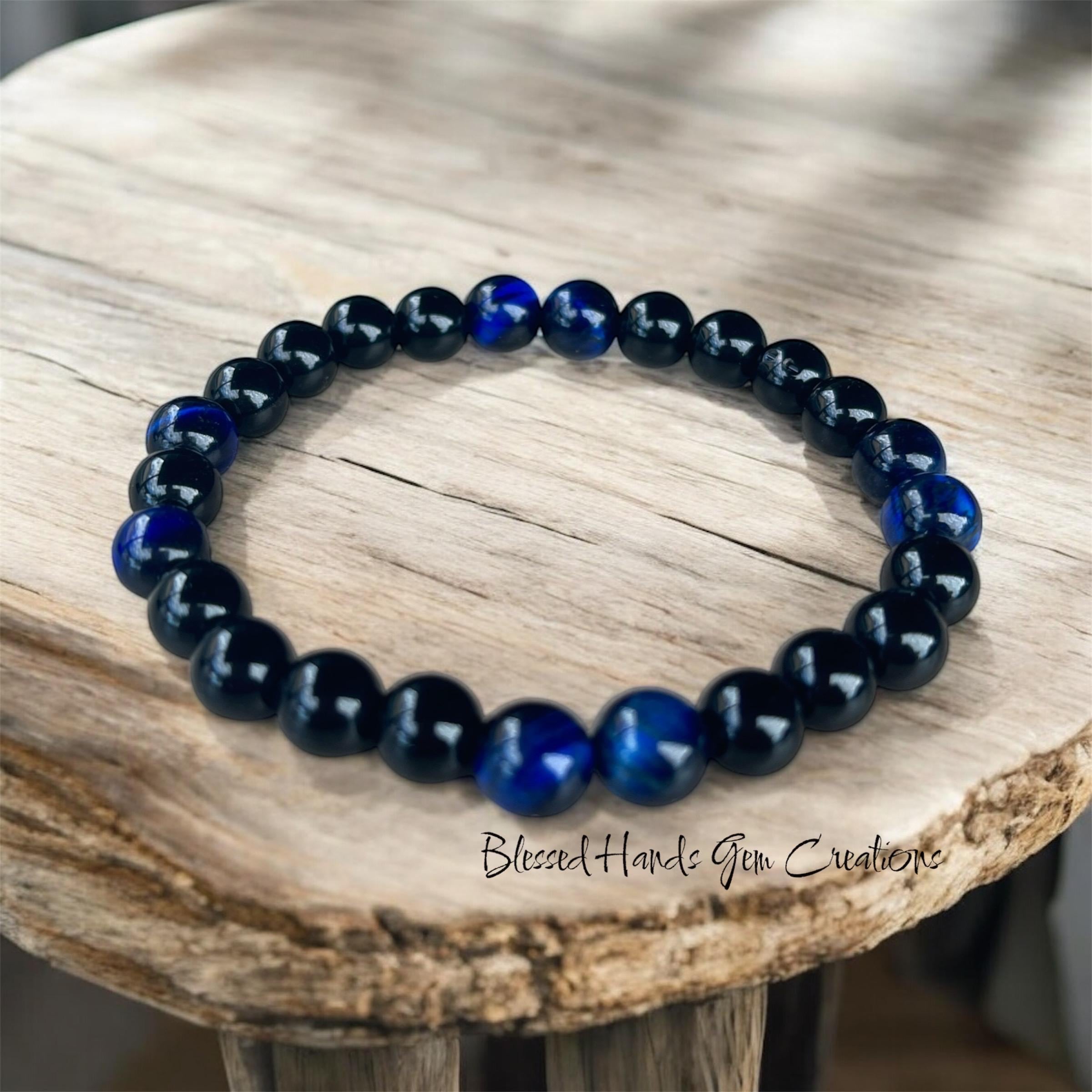 Bracelet is handcrafted on a durable stretch cord & made with Tiger eye and black onyx gemstones. Suitable for Men and Women.