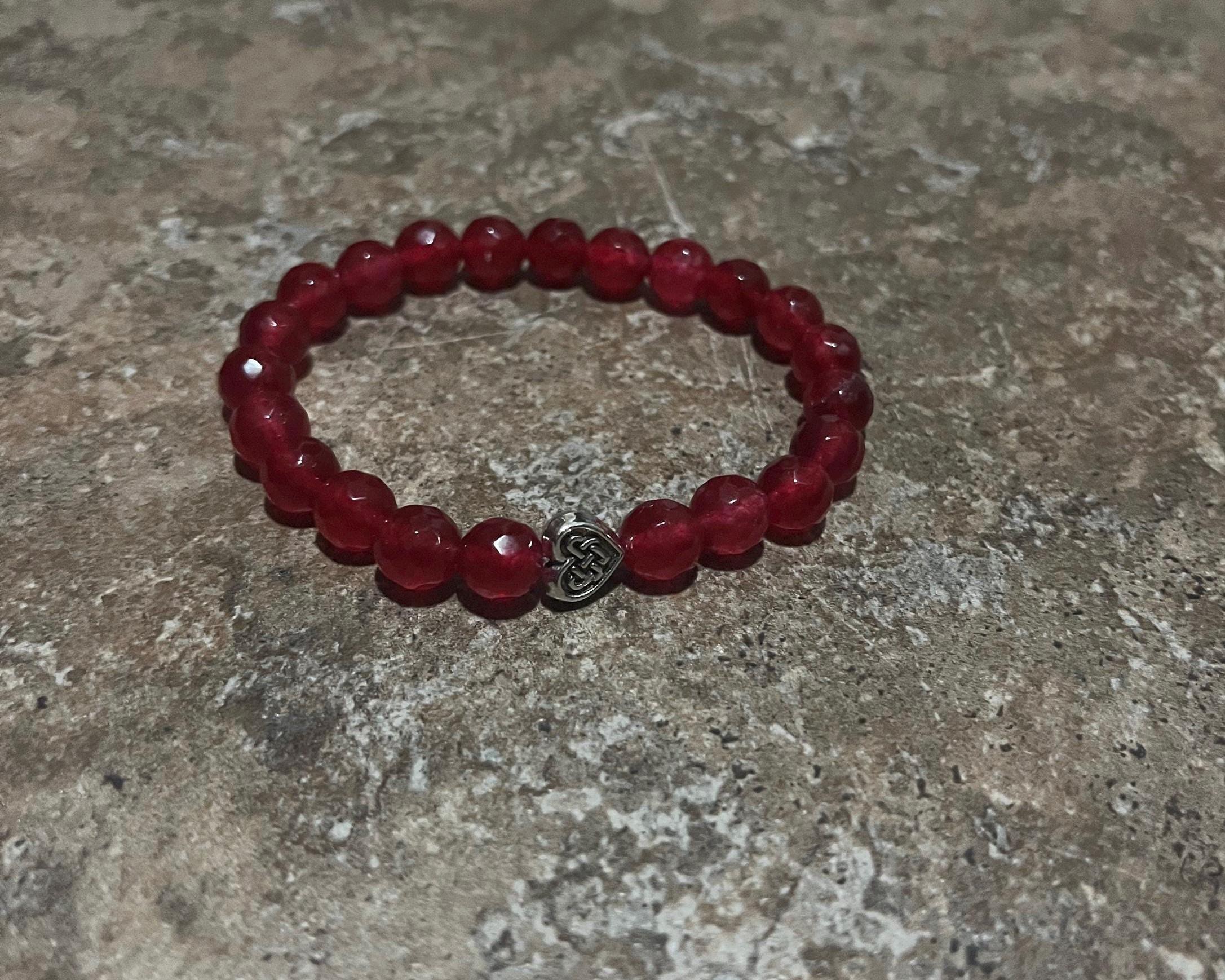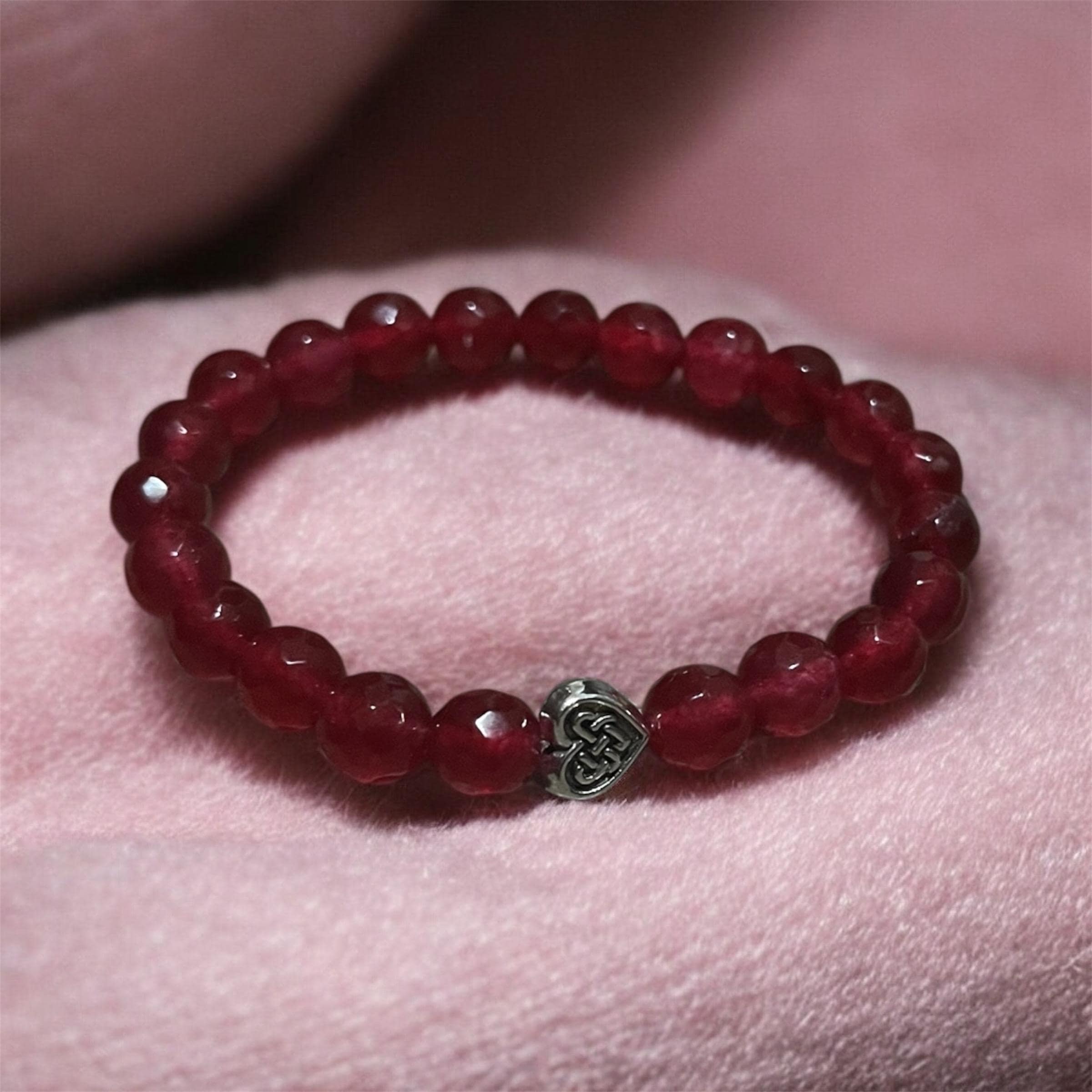 ✨ Details Faceted Ruby Chalcedony gemstone beads Heart charm accent Stretch bracelet for a comfortable fit Handmade with intention and positive energy One-of-a-kind creation