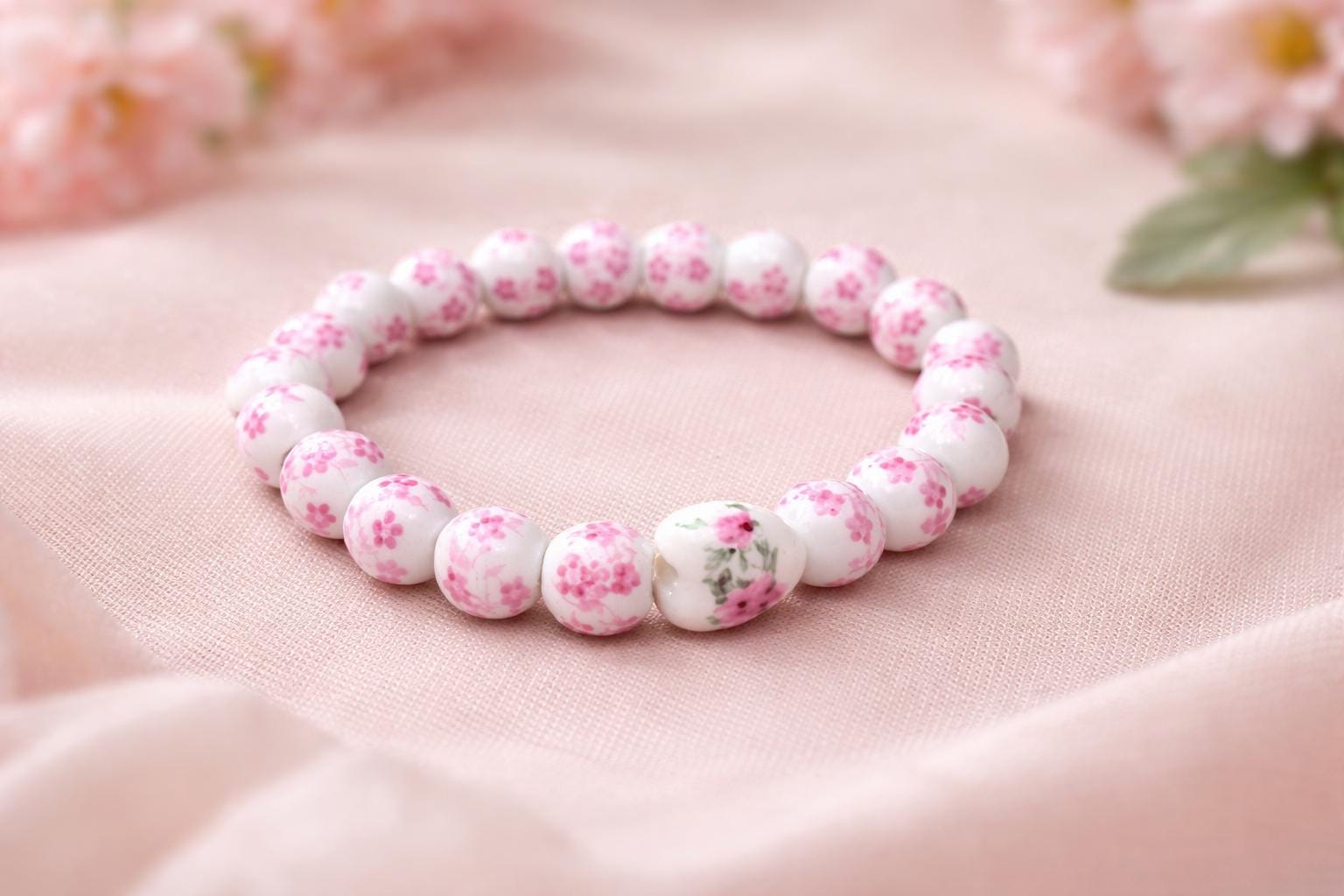 Description: This delicate Pink Flower Ceramic Bracelet is a beautiful blend of softness and charm. Featuring glossy white ceramic beads adorned with pink floral details, this bracelet is finished with a sweet porcelain flower heart charm that adds a romantic touch. Hand-strung with care, this bracelet is perfect for everyday wear or as a thoughtful gift. Its feminine design makes it ideal for spring, Mother’s Day, birthdays, or anyone who loves dainty floral jewelry. ✨ Details: • White ceramic beads with pink floral design • Porcelain flower heart charm • Stretch bracelet for a comfortable fit • Lightweight and easy to wear • Handmade with love and intention Perfect worn alone or stacked with other favorites for a soft, elegant look. 💗 A beautiful reminder of love, grace, and gentle beauty.