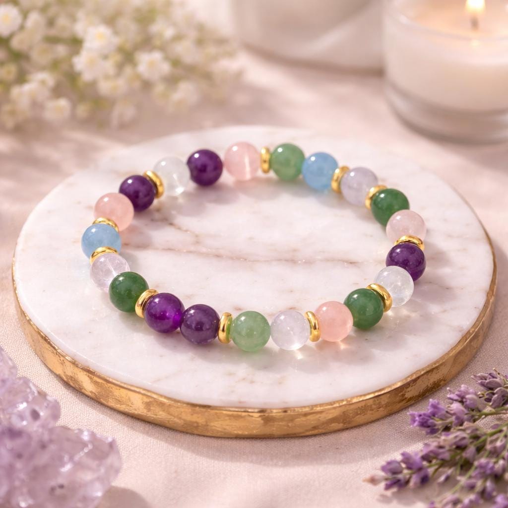 A soothing combination of Amethyst, Green Aventurine, Rose Quartz, Clear Quartz, and Aquamarine.