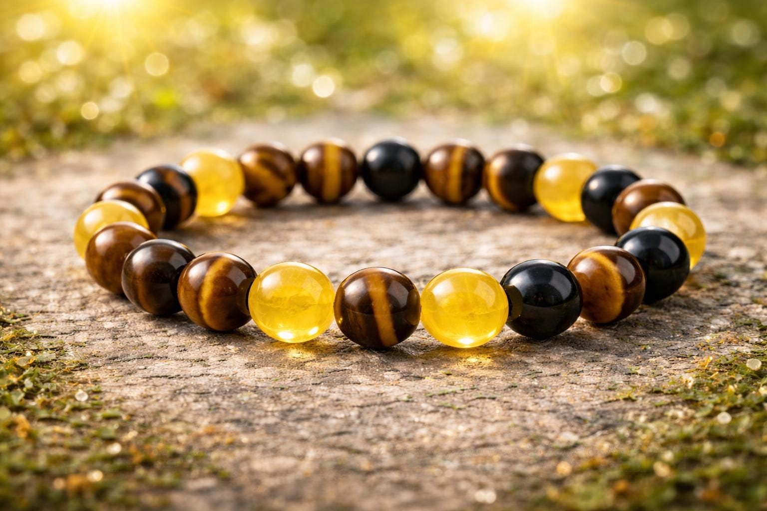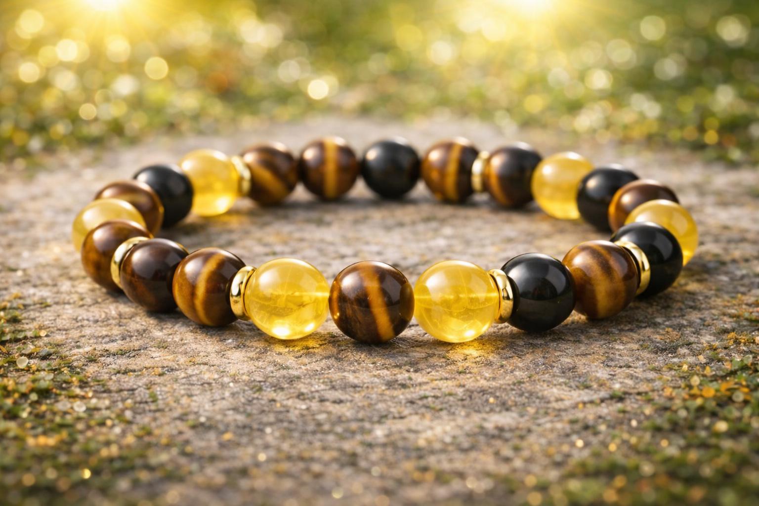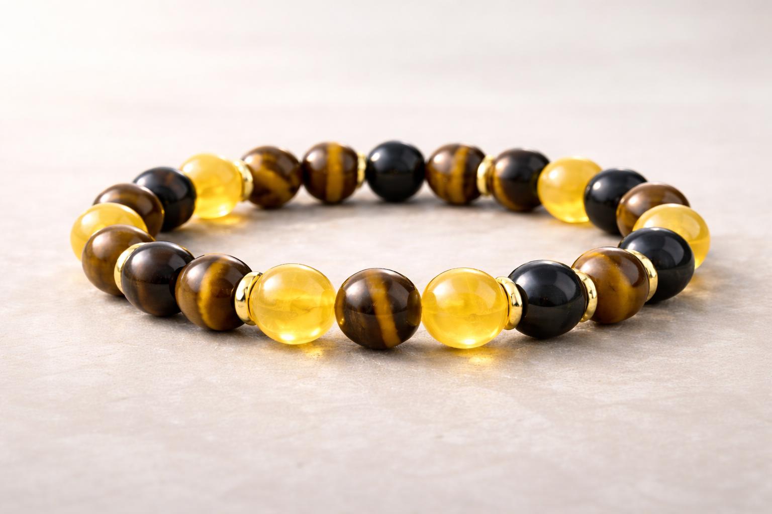 Bracelet Details • Natural Tiger Eye, Citrine & Black Onyx • round gemstone beads • Elegant gold donut spacers • Stretch bracelet for comfortable wear • Unisex design • Perfect for everyday wear or special occasions Perfect Gift For • Birthdays • Spiritual jewelry lovers • Crystal enthusiasts • Protection and abundance bracelets • Meaningful handmade gifts Each bracelet is carefully handmade and unique, making it a beautiful addition to any jewelry collection. Details: 8-millimeter authentic gemstone beads Handcrafted on a durable stretch cord for a comfortable fit. Every gemstone is unique and may vary slightly in size and color.