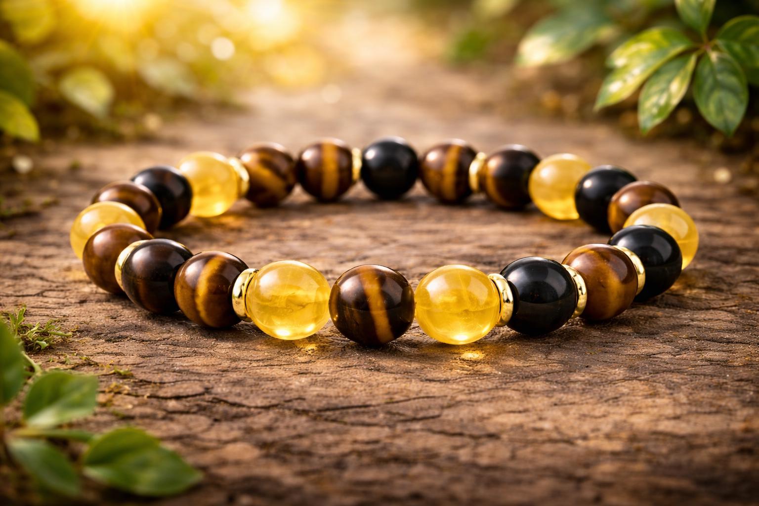 Elevate your energy and style with this beautiful Tiger Eye, Citrine, and Black Onyx gemstone bracelet.